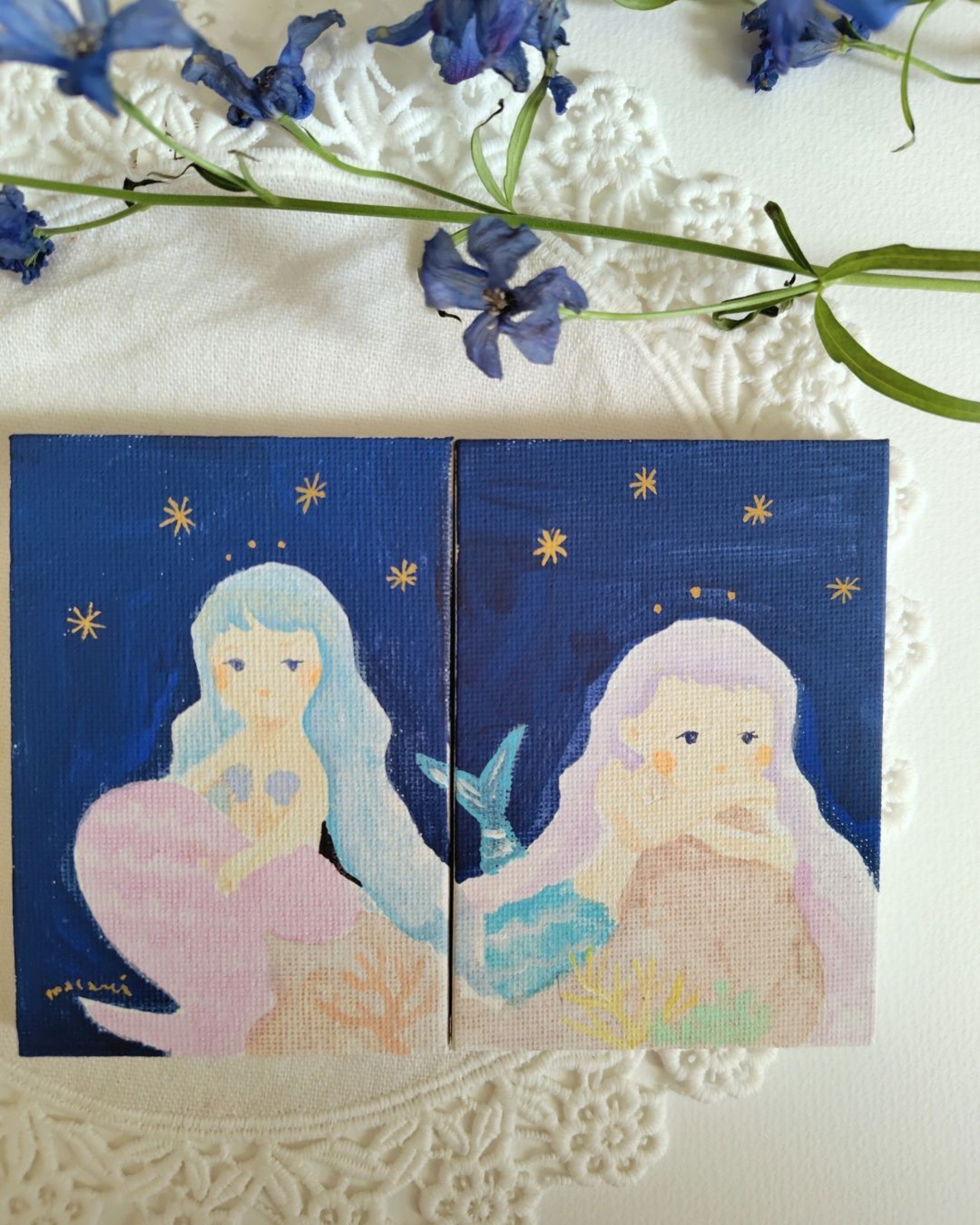 手のひらなサイズのキャンバスに、双子のマーメイドを描きました。